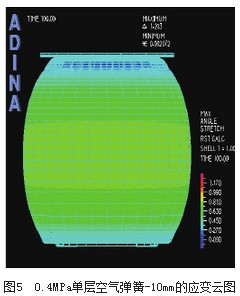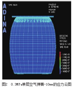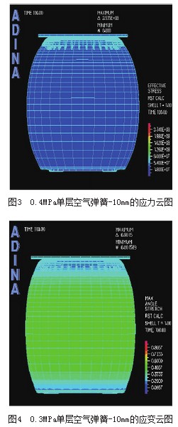 對自由膜式空氣彈簧的模擬工況為:空氣彈簧壓縮到-10mm位移時,對有限元模型腔內分別設定0.3MPa和0.4MPa的初始壓力,研究不同初始壓力對空氣彈簧垂直剛度.性的影響,應力和應變的云圖如圖2圖5所示。